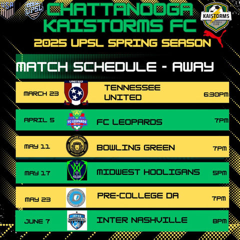 - CHATTANOGA KAISTORMS FC VS TENNESSEE TEMPOSat, Apr 12CHATTANOGA TENNESSEE